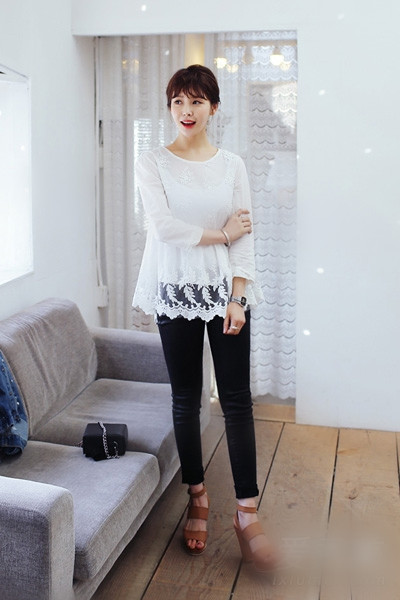 白色蕾丝衫简约圆领设计,显得乖巧可人,透视薄纱加上精美的蕾丝花纹,穿出柔美气质。