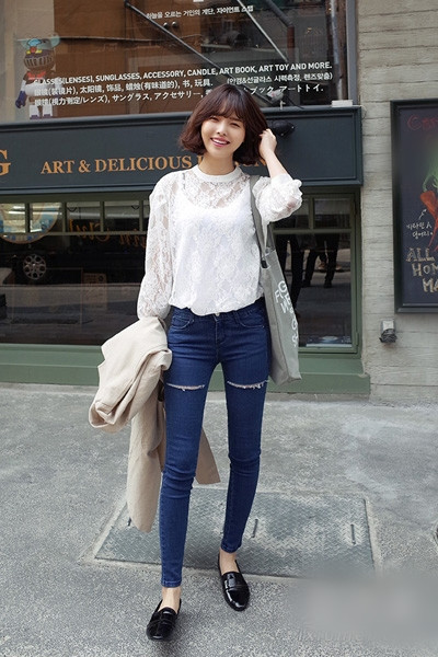 白色蕾丝衫配经典的牛仔裤,镂空花纹带来透视的效果,清纯而不失性感,将蕾丝衫扎起来穿,使下半身显得很修长。