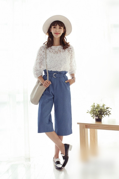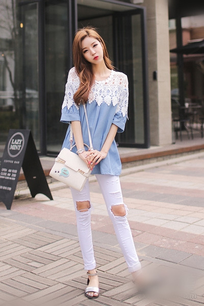 浅蓝色上衣肩部采用蕾丝拼接,增添精致柔美的感觉,更具淑女风情,配白色破洞牛仔裤,增添时髦帅气感。