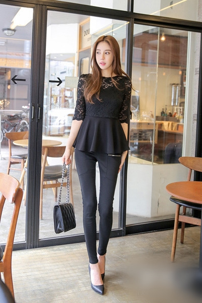 黑色蕾丝上衣性感迷人,穿出诱人气息,下摆采用荷叶边设计,打造成裙摆的效果,轻盈飘逸,更加柔美,配黑色小脚裤和高跟鞋,尽显好身材。
